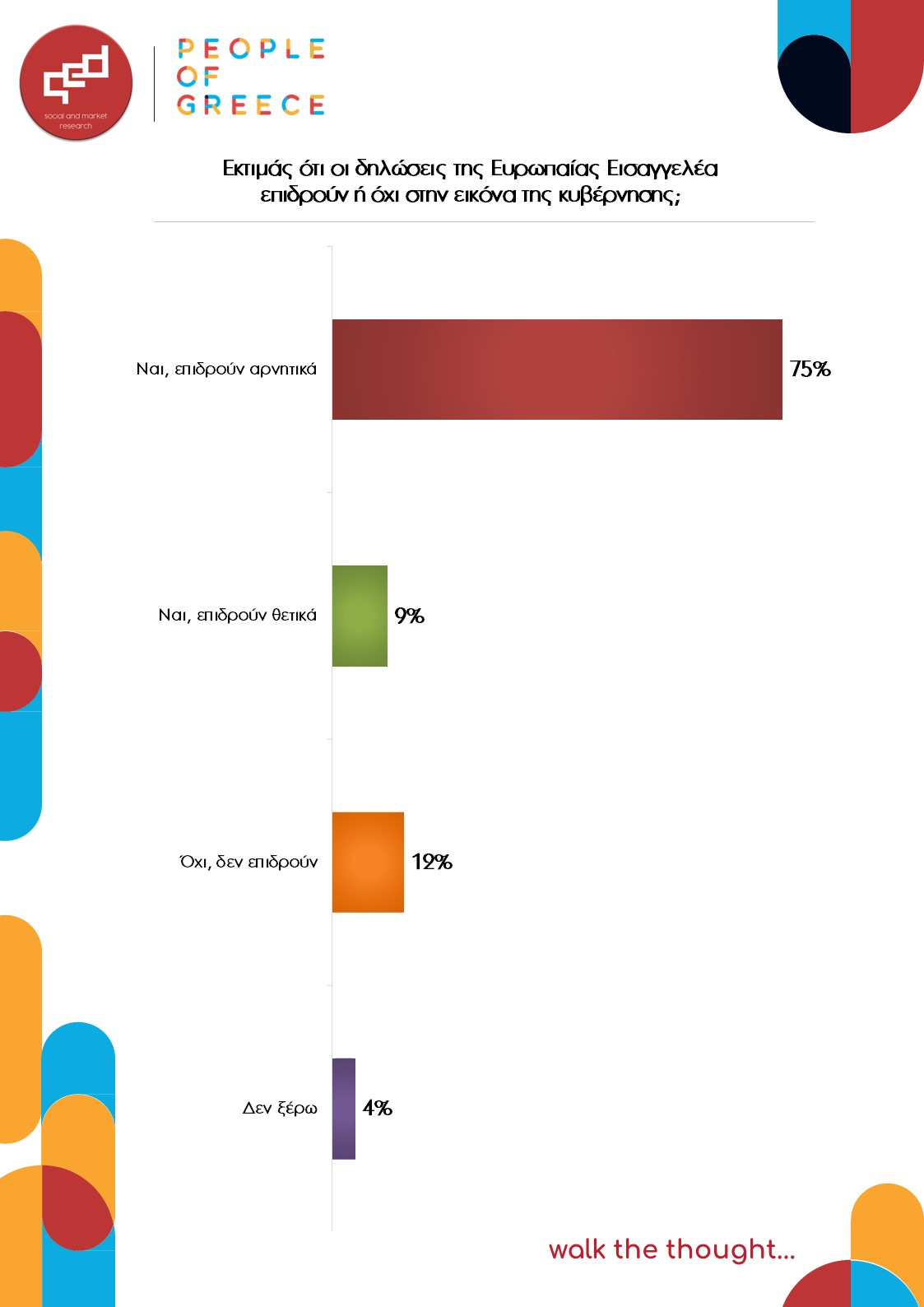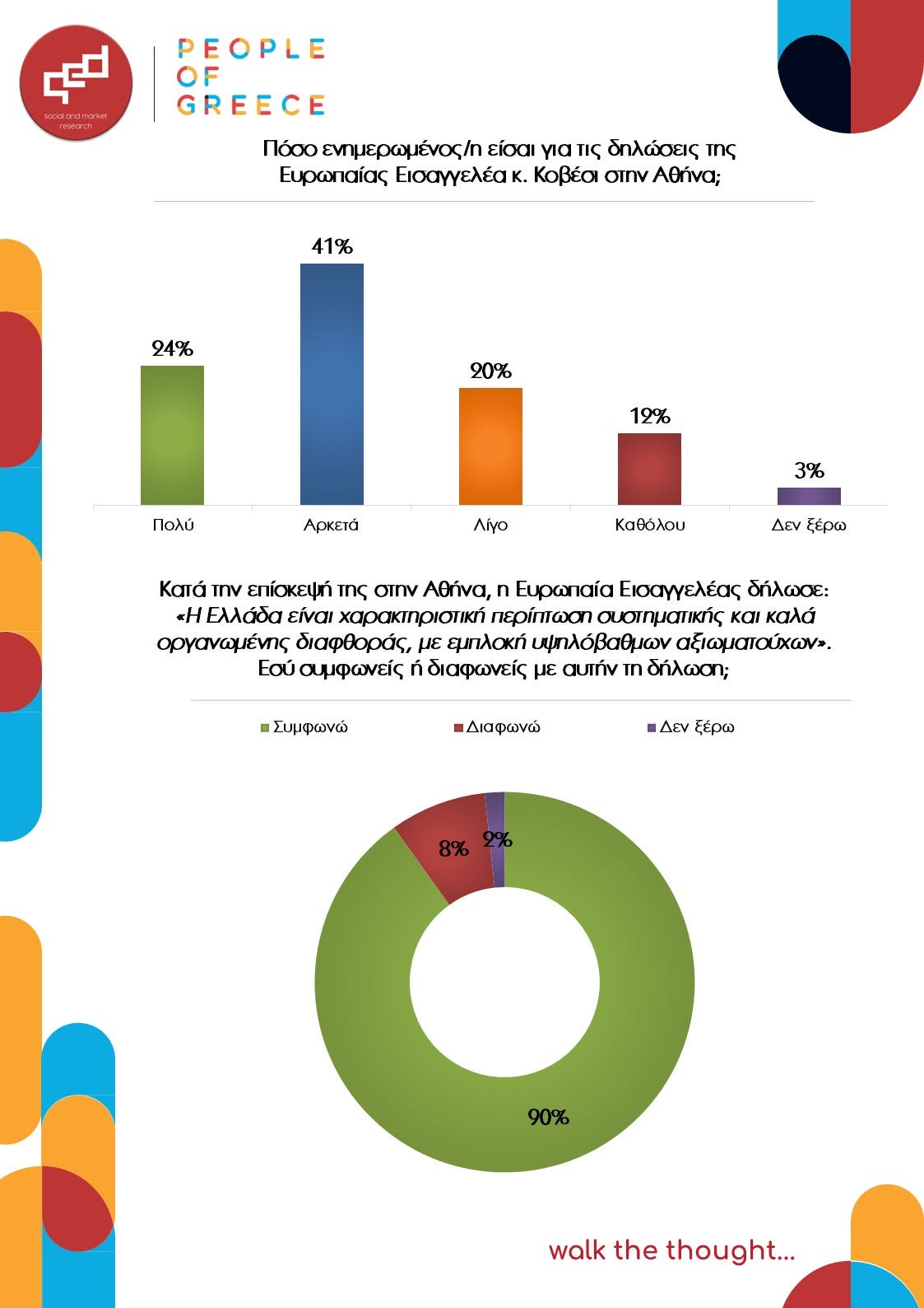 - Η ελληνική κοινωνία δεν εκπλήσσεται πλέον από αποκαλύψεις διαφθοράς, απλώς την καταγράφει ως παθολογία. Εννέα στους δέκα Έλληνες συμφωνούν με την άποψη που εξέφρασε η Ευρωπαία Εισαγγελέας, κατά την πρόσφατη επίσκεψή της στην Ελλάδα, ότι υπάρχει καλά οργανωμένη διαφθορά με εμπλοκή υψηλόβαθμων αξιωματούχων. Γενικότερα, οι δηλώσεις της Ευρωπαίας Εισαγγελέα πήραν ευρεία δημοσιότητα στην κοινή γνώμη και επίδρασαν αρνητικά στην εικόνα των πολιτών για την κυβέρνηση.