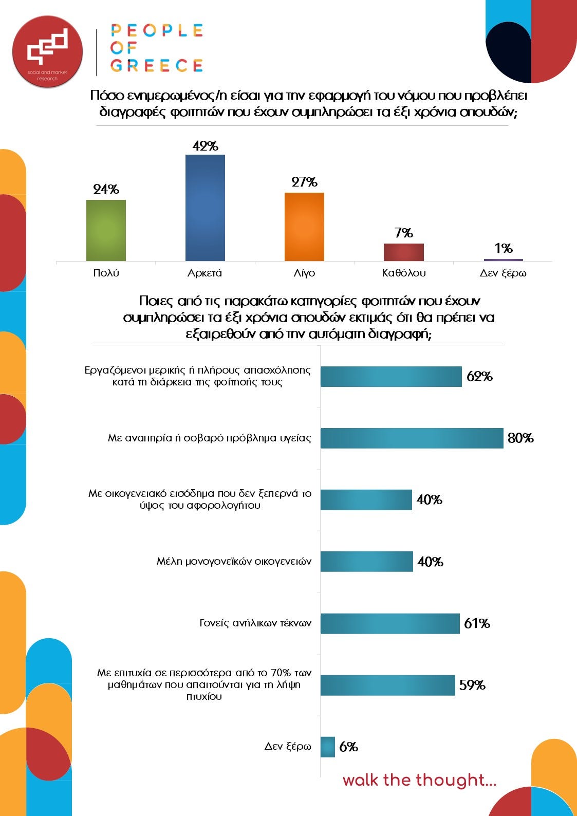 - Ο νόμος για τις αυτόματες διαγραφές φοιτητών που έχουν συμπληρώσει τα έξι έτη φοίτησης διχάζει τους Έλληνες σε ιδεολογική βάση. Αναπηρία και εργασία γίνονται δεκτές ως εξαιρέσεις, ενώ οι οικονομικές δυσκολίες όχι.
