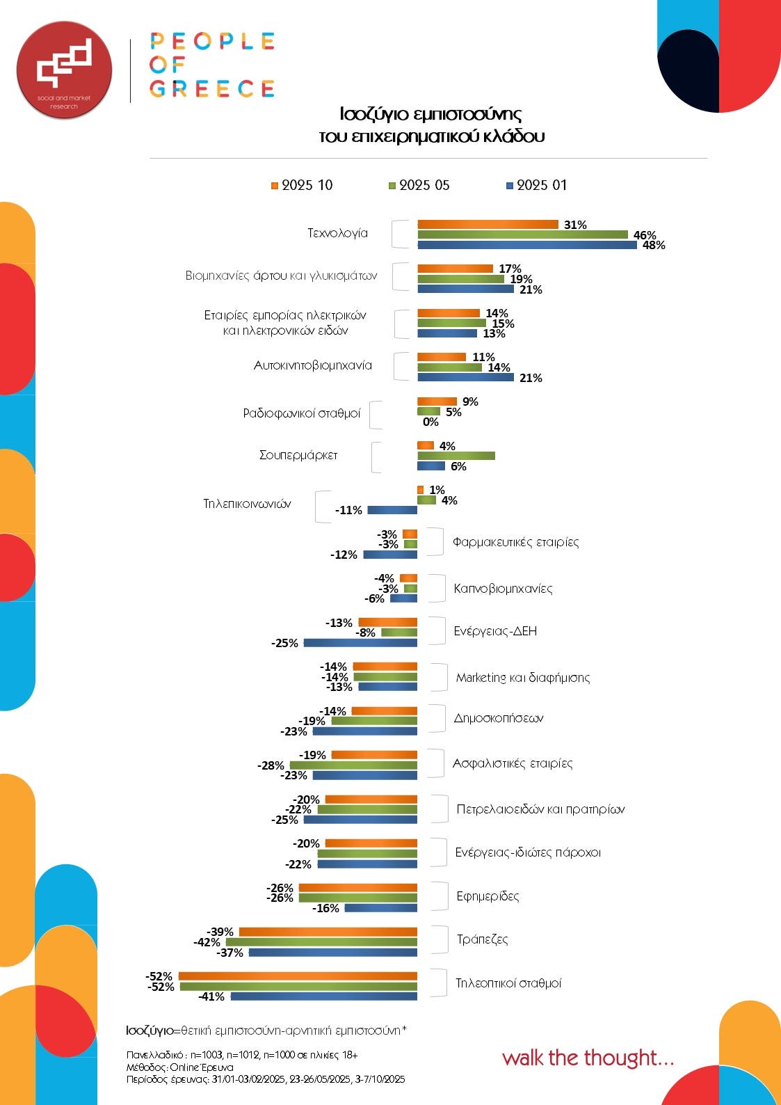 - Οι Έλληνες χάνουν την εμπιστοσύνη τους και στους επιχειρηματικούς κλάδους, καθώς οι σχετικοί δείκτες παρουσιάζουν γενικευμένη πτώση, με εξαίρεση την ενέργεια και το φάρμακο, για τους οποίους κλάδους ωστόσο το ισοζύγιο εμπιστοσύνης παραμένει αρνητικό. Παρατηρείται επίσης σημαντική πτώση εμπιστοσύνης στον κλάδο τεχνολογίας, ο οποίος όμως παραμένει αυτός με το πλέον θετικό ισοζύγιο. Το εύρημα πάντως υποδηλώνει πιθανώς μια κόπωση από την αφήγηση της προόδου.