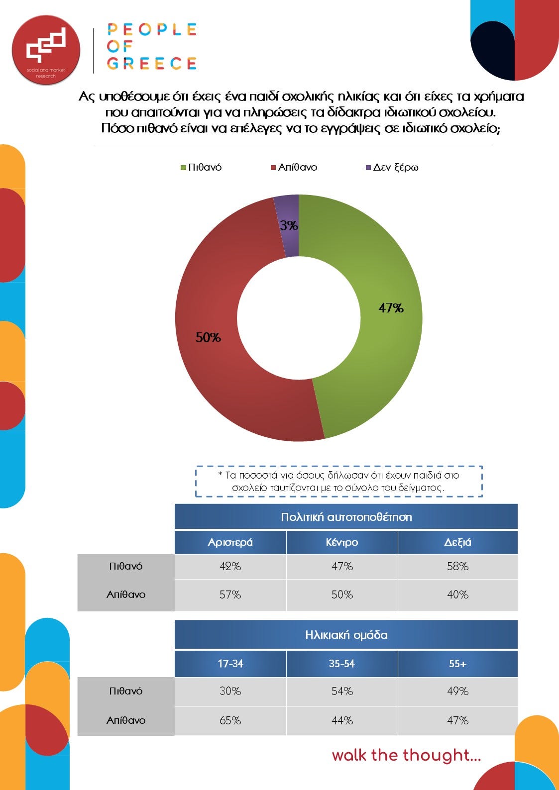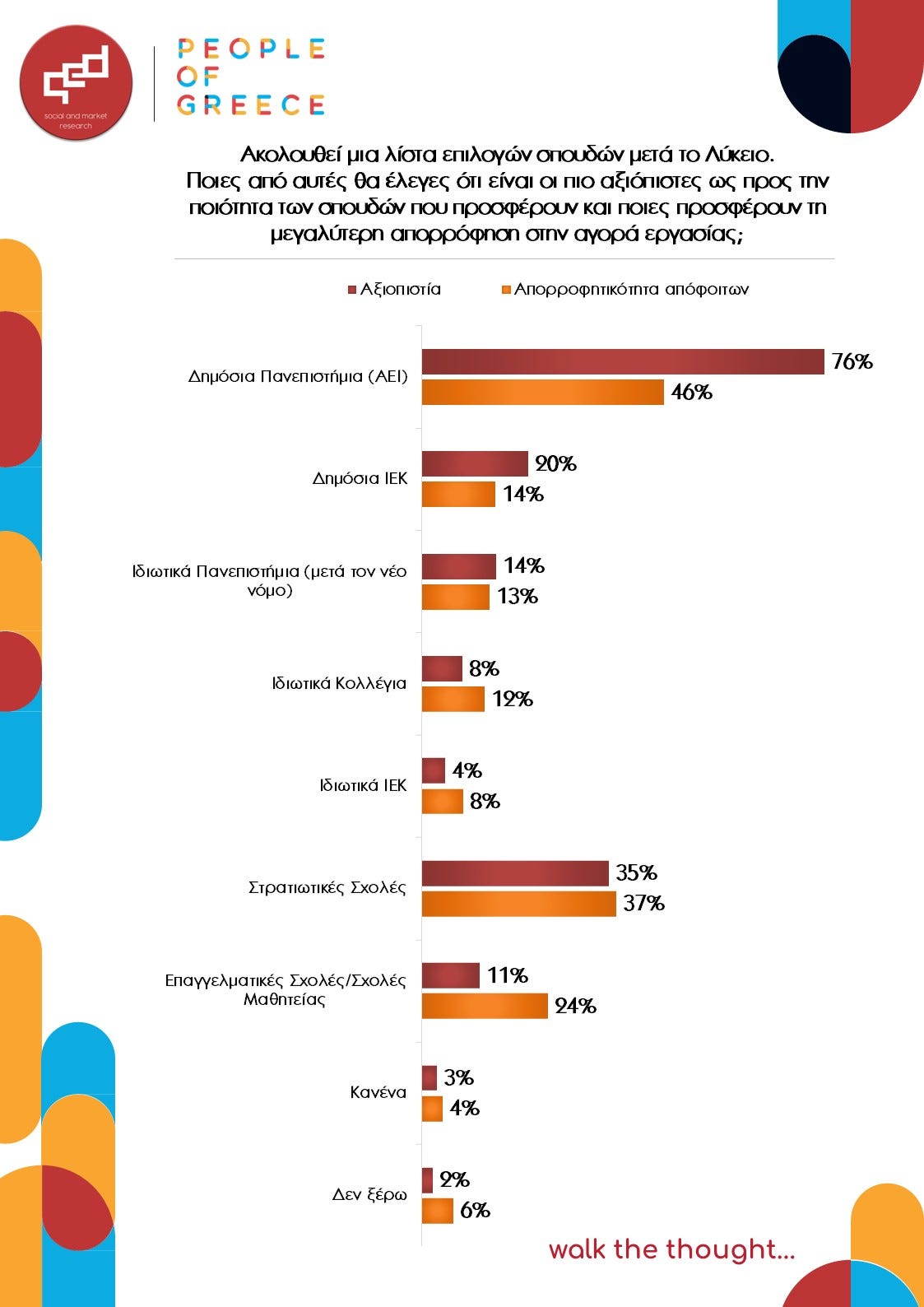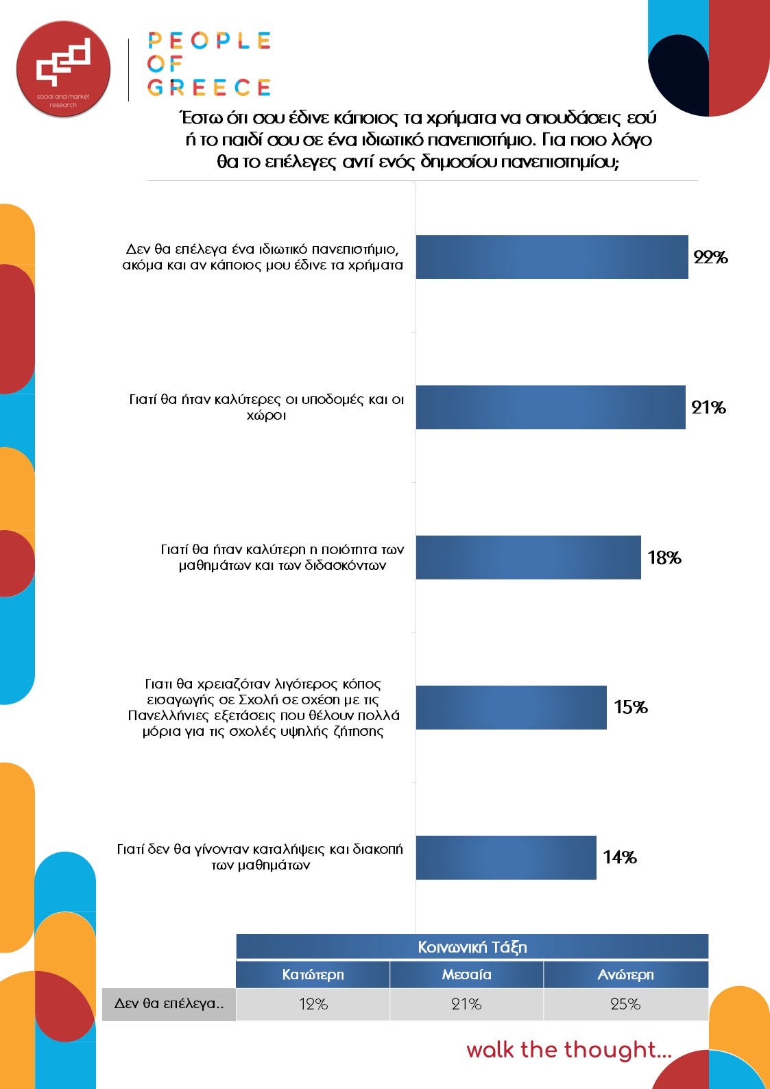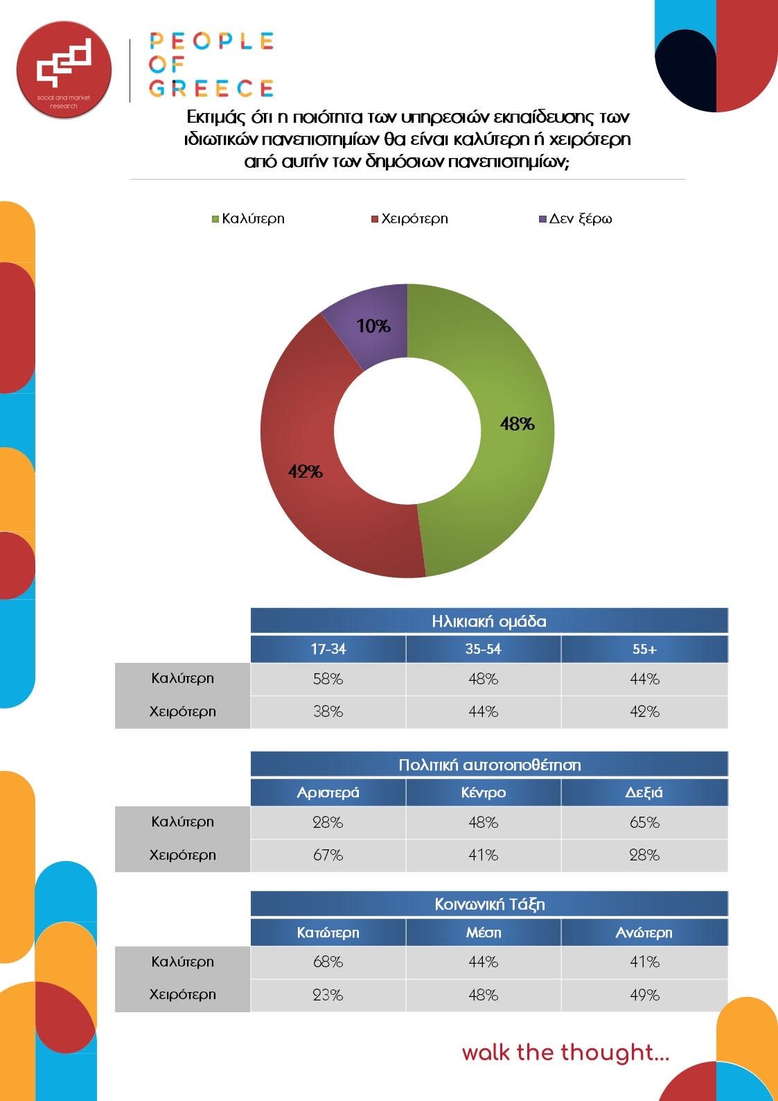 Τα δημόσια πανεπιστήμια θεωρούνται πιο αξιόπιστα από ιδιωτικούς φορείς τριτοβάθμιας εκπαίδευσης, αλλά αρκετοί Έλληνες (40%) πιστεύουν ότι τα ιδιωτικά πανεπιστήμια θα προσφέρουν καλύτερες υπηρεσίες. Η ελκυστικότητα των ιδιωτικών πανεπιστήμια συνδέεται με πρακτικότερα ζητήματα, όπως η ευκολότερη εισαγωγή σε σχολές υψηλής ζήτησης και οι καλύτερες υποδομές.