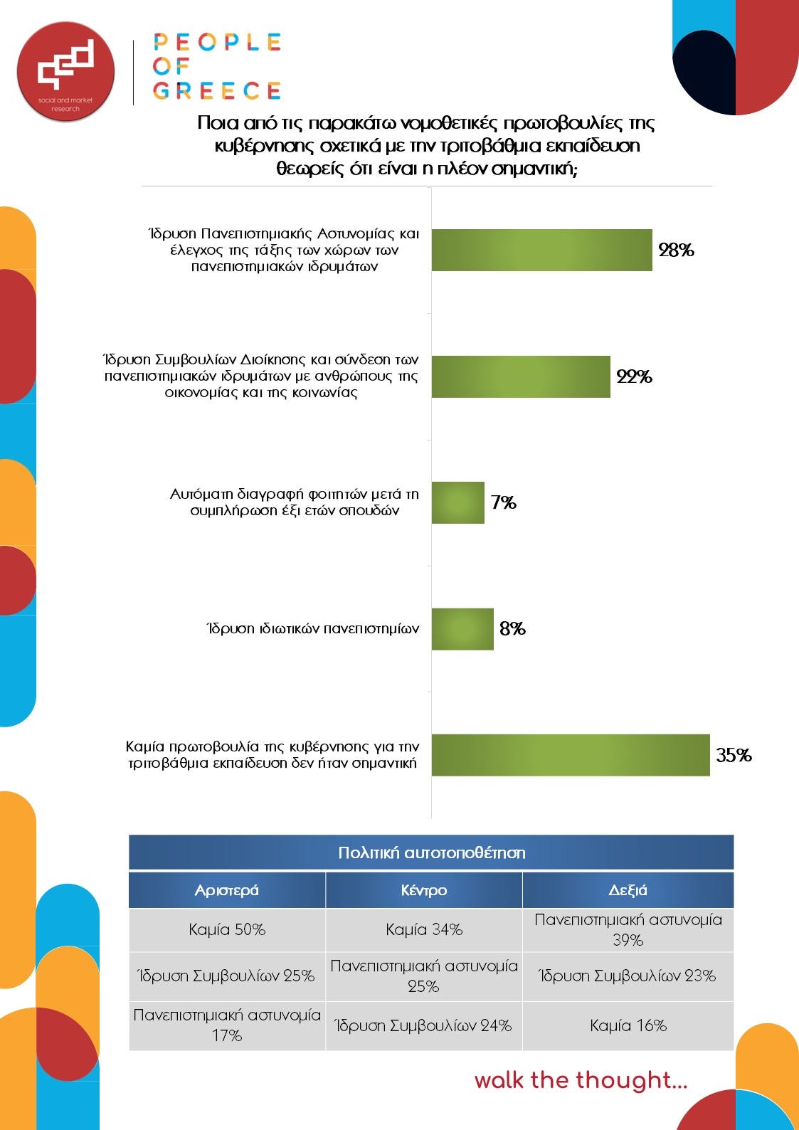 - Οι πολιτικές που προώθησε η κυβέρνηση στον χώρο της τριτοβάθμιας εκπαίδευσης δεν θεωρούνται σημαντικές, με οριακή εξαίρεση την ίδρυση της πανεπιστημιακής αστυνομίας, η οποία γίνεται αποδεκτή από δεξιόστροφους ψηφοφόρους και η οποία ωστόσο αποσύρθηκε ουσιαστικά από την κυβέρνηση.