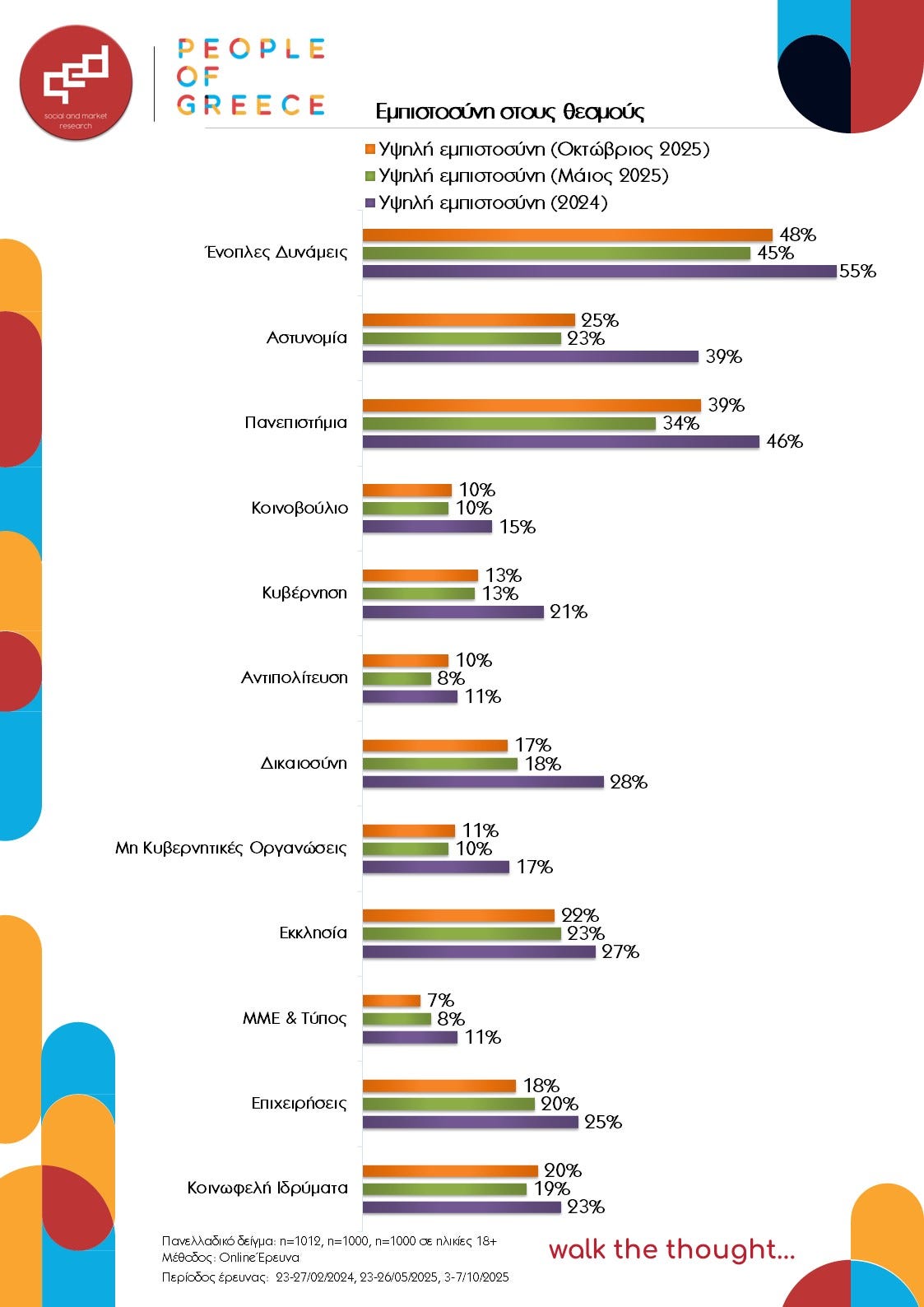 - Οι Έλληνες δεν νιώθουν ότι οι θεσμοί λειτουργούν δίκαια ή αποτελεσματικά. Οι δείκτες θεσμικής εμπιστοσύνης σημειώνουν σημαντική πτώση μέσα στον τελευταίο χρόνο, με την αστυνομία και τη δικαιοσύνη να εμφανίζουν την εντονότερη (>30%) πτώση. Οι μόνοι θεσμοί που εμφανίζουν σχετικά υψηλότερους δείκτες εμπιστοσύνης είναι οι Ένοπλες Δυνάμεις και τα Πανεπιστήμια.