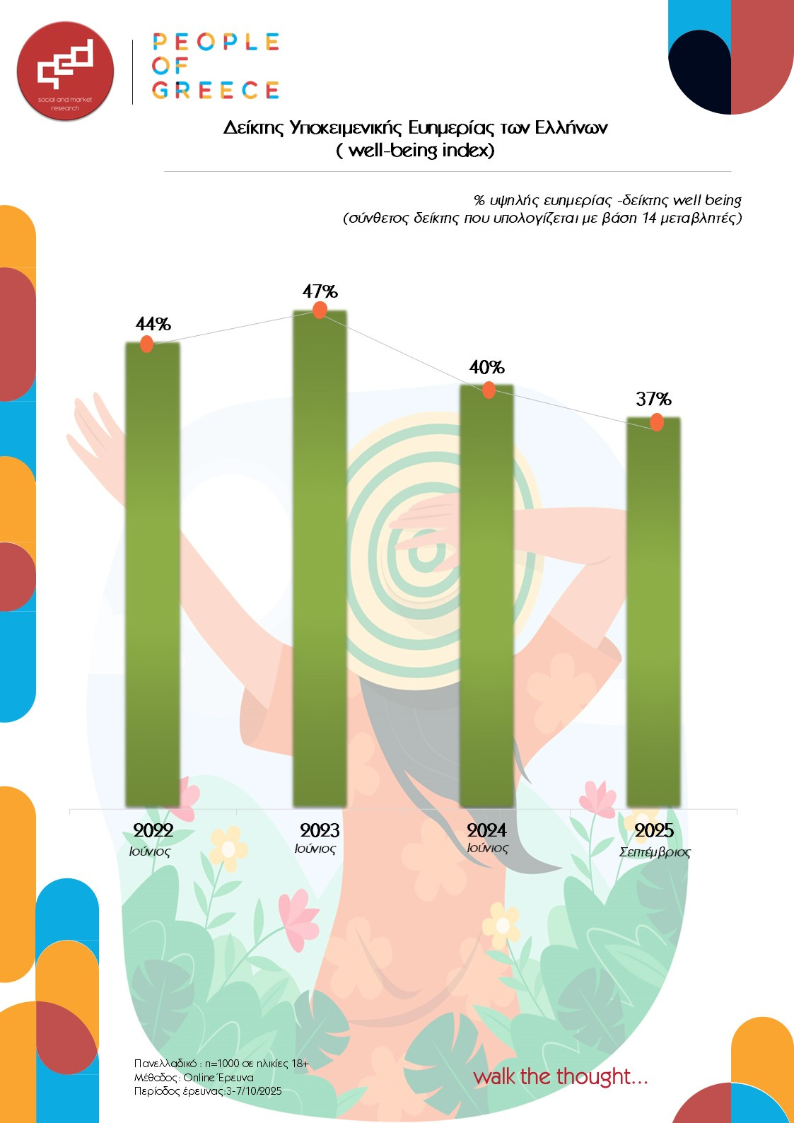 Οι Έλληνες αισθάνονται λιγότερο ευτυχισμένοι, με τον δείκτη υποκειμενικής ευημερίας να έχει μειωθεί δραματικά (-20%) μέσα στα τελευταία δύο χρόνια. Γυναίκες και νέοι, δηλαδή οι ομάδες που ιστορικά στηρίζουν την κοινωνική αναπαραγωγή, νιώθουν χειρότερα από άνδρες και μεγαλύτερους.
