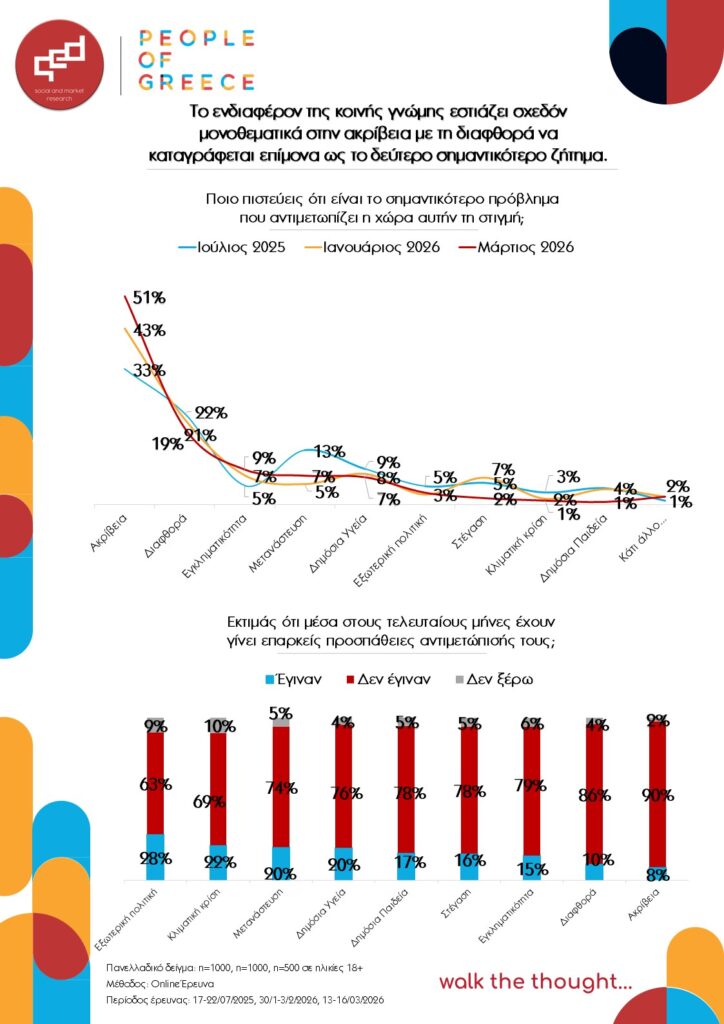 • Γιατί η πλειοψηφία των πολιτών στην Ελλάδα θεωρεί την ακρίβεια σημαντικότερο πρόβλημα από κάθε άλλο, και ποιοι παράγοντες εξηγούν τη μεγάλη αύξηση της σημασίας της σε σχέση με το 2025;