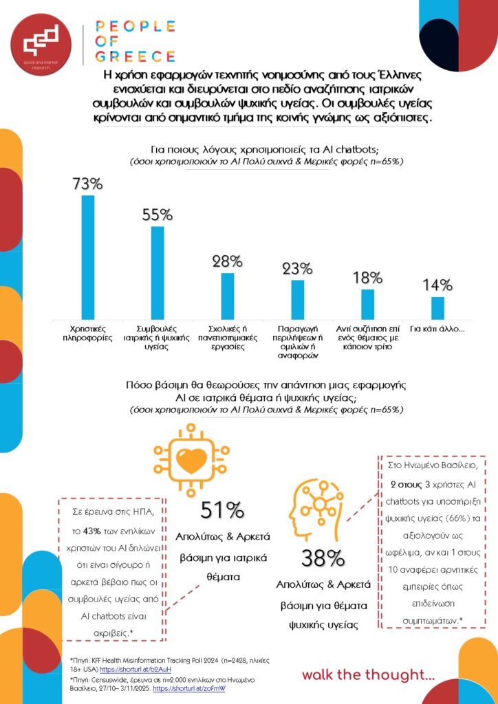 • τη χρήση εφαρμογών τεχνητής νοημοσύνης για ιατρικές συμβουλές και για συμβουλές ψυχικής υγείας, καθώς και την έκταση της χρήσης αυτής,