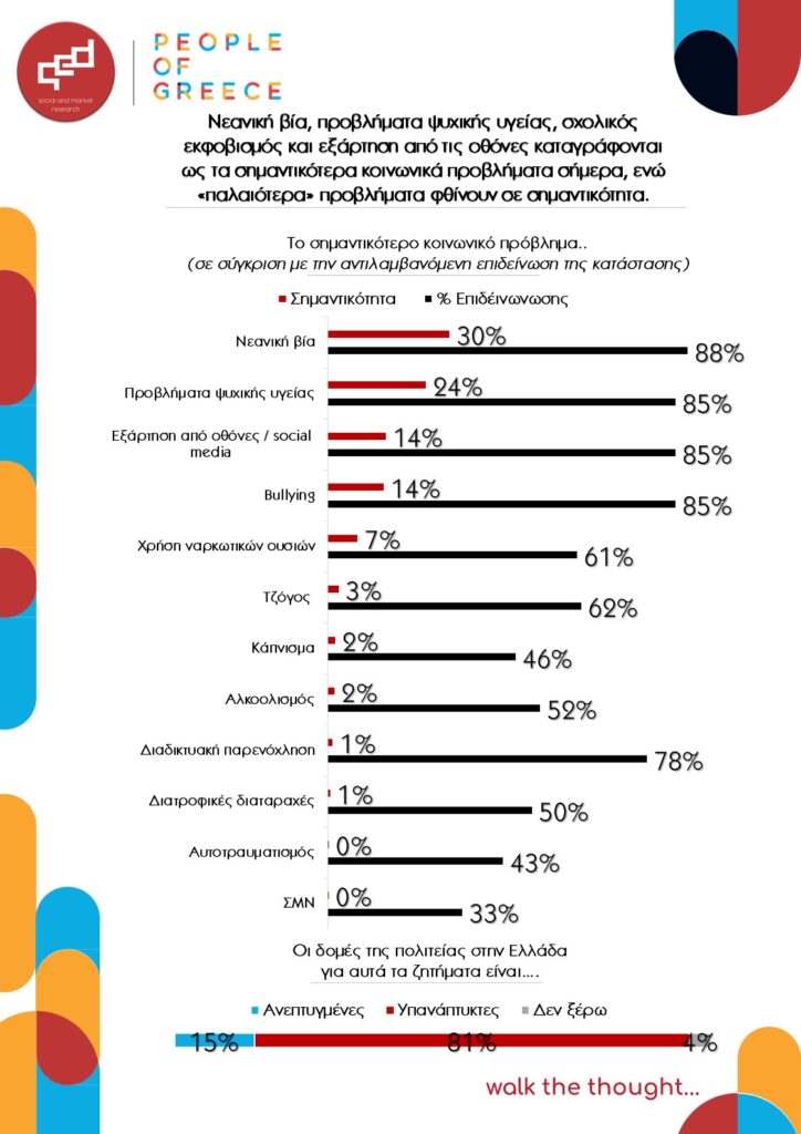 • την έκταση κοινωνικών προβλημάτων, όπως η νεανική βία, οι διαταραχές στην ψυχική υγεία, ο σχολικός εκφοβισμός και η εξάρτηση από τις οθόνες, και την επάρκεια ενεργειών αντιμετώπισής τους,