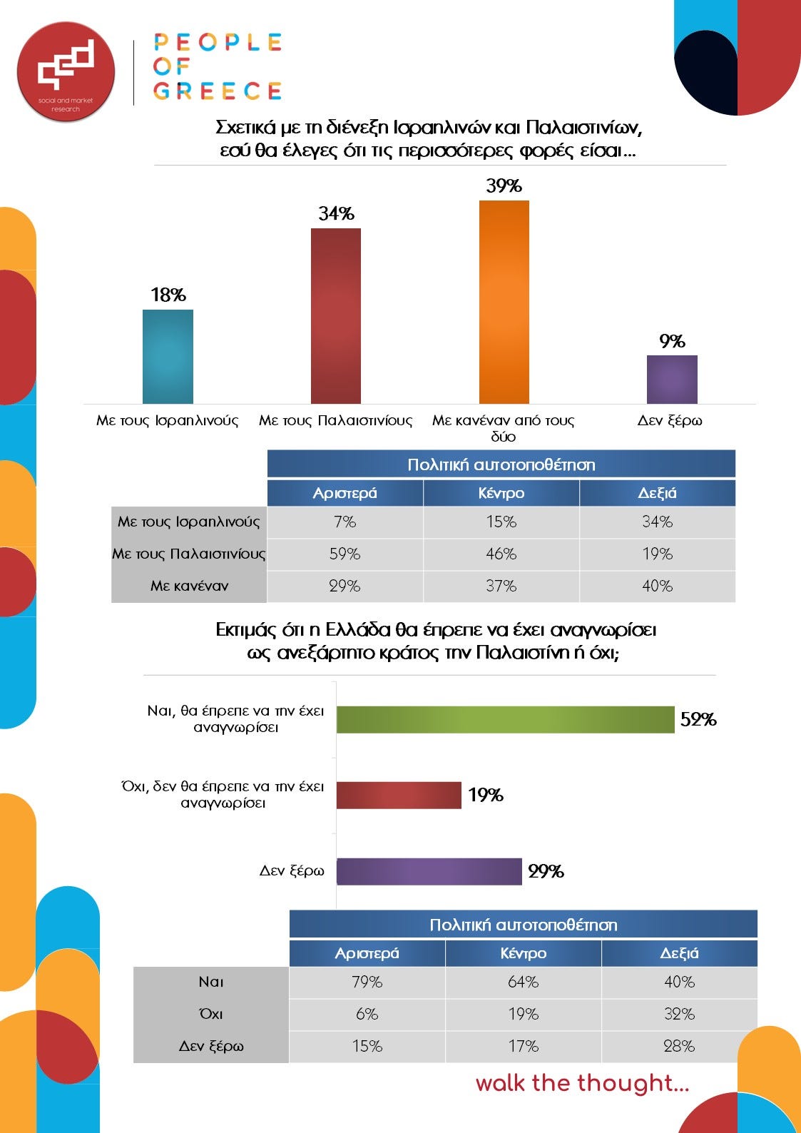 - Η στάση απέναντι στη διένεξη Ισραήλ–Παλαιστίνης αντικατοπτρίζει την ελληνική ιστορική φιλοπαλαιστιανική παράδοση, αλλά και μια νέα πραγματιστική στροφή. Οι περισσότεροι Έλληνες δεν παίρνουν θέση (40%), όμως η πλειονότητα (52%) θεωρεί ότι η Ελλάδα θα έπρεπε να αναγνωρίσει την Παλαιστίνη. Αυτό υποδεικνύει συμπάθεια προς τους Παλαιστινίους, αλλά και αποστασιοποίηση από διπολικές λογικές — μια τάση πιο ουδέτερη και «ρεαλιστική» που αντανακλά ίσως την κόπωση από τα διεθνή διλήμματα.