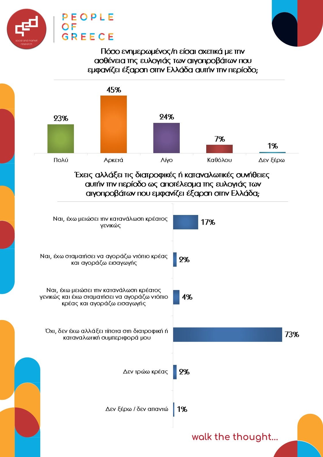 - Η στάση απέναντι στην ευλογιά των αιγοπροβάτων δείχνει ότι οι Έλληνες, παρά την ενημέρωση, δεν αντιδρούν πανικόβλητα ούτε αλλάζουν μαζικά συμπεριφορές κατανάλωσης. Αυτό φανερώνει ωριμότητα ή ενδεχομένως απάθεια, ανάλογα με την οπτική: από τη μία, δεν υπάρχει υπερβολικός φόβος, από την άλλη, ενδέχεται να υπάρχει χαμηλή εμπιστοσύνη στην αξία των προειδοποιήσεων ή αίσθηση αδυναμίας ελέγχου.