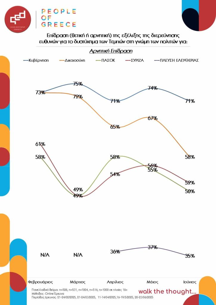 - Η επίδραση των εξελίξεων γύρω από το δυστύχημα των Τεμπών παραμένει έντονα αρνητική για την κυβέρνηση, ωστόσο παρατηρείται τάση αποκλιμάκωσης της αρνητικής επίδρασης στο ΠΑΣΟΚ και τον ΣΥΡΙΖΑ και σαφής αποκλιμάκωση της αρνητικής επίδρασης στη Δικαιοσύνη.