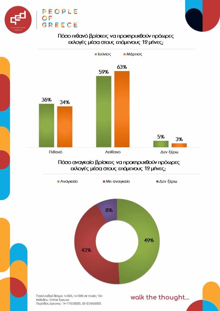 Ένας στους τρεις Έλληνες εκτιμούν από αρκετά πιθανή έως σίγουρη την προκήρυξη πρόωρων εκλογών εντός των επομένων 12 μηνών. Παρότι το ποσοστό εμφανίζεται σταθερό σε σύγκριση με τη μέτρηση προ τριών μηνών, το ποσοστό εκείνων που αποκλείουν ένα τέτοιο ενδεχόμενο έχει μειωθεί σημαντικά σε σύγκριση με τη μέτρηση του Μαρτίου 2025.