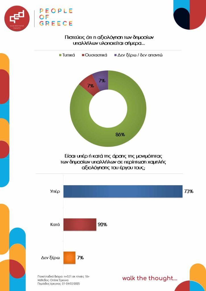 - Η συντριπτική πλειονότητα των Ελλήνων εκτιμούν ότι η αξιολόγηση των δημοσίων υπαλλήλων γίνεται ανεπαρκώς, ως προς τον τρόπο αξιολόγησης, και τυπικά, ως προς το είδος των κριτηρίων που χρησιμοποιούνται. Οι εκτιμήσεις αυτές γέρνουν σημαντικά την πλάστιγγα υπέρ της άρσης της μονιμότητας των δημοσίων υπαλλήλων (72%).