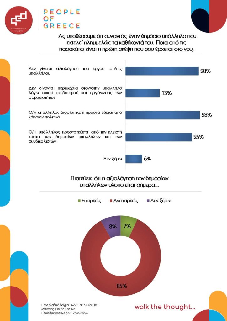 - Η πρώτη σκέψη των Ελλήνων όταν συναντούν έναν δημόσιο υπάλληλο που εκτελεί πλημμελώς τα καθήκοντά του δεν είναι η ίδια, καθώς για κάποιους η ερμηνεία βρίσκεται στην απουσία αξιολόγησης (28%), για κάποιους άλλους στον διορισμό ή στην προστασία από κάποιον πολιτικό (28%) και για ορισμένους άλλους στην προστασία του υπαλλήλου από την κλειστή κάστα δημοσίων υπαλλήλων (25%).