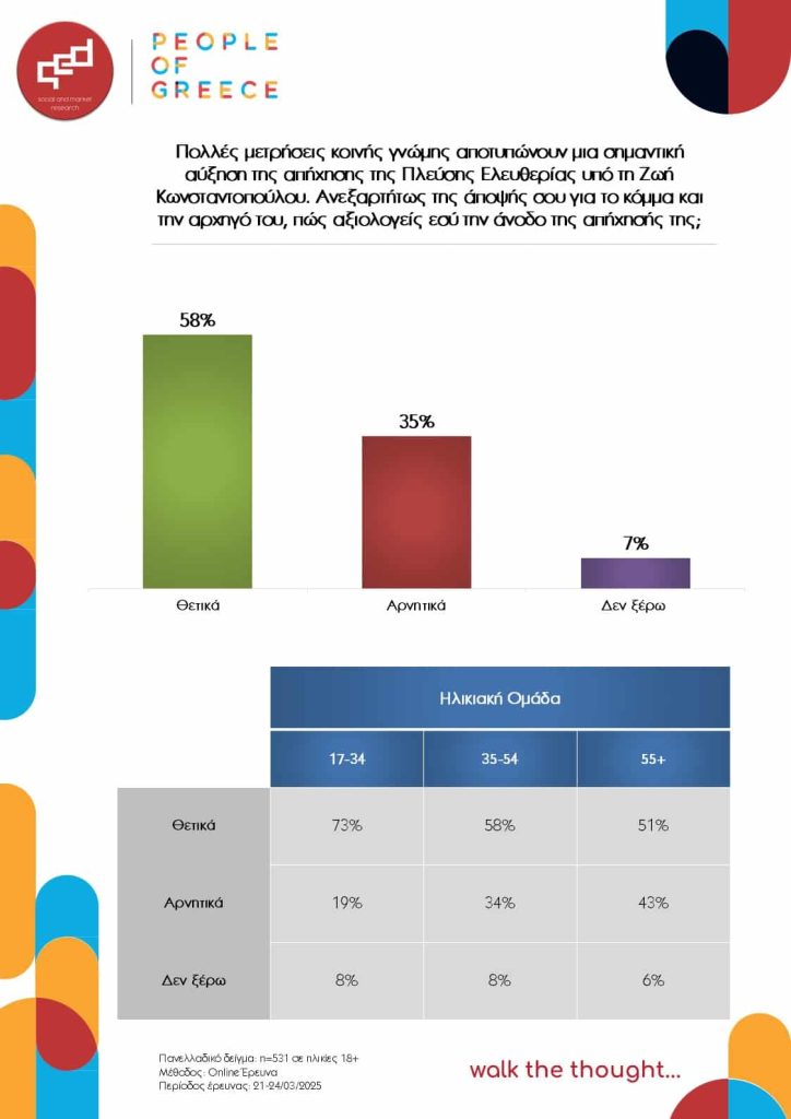 - 3 στους 5 Έλληνες αξιολογούν ως θετική την αύξηση της απήχησης της Πλεύσης Ελευθερίας, ενώ μεταξύ των νέων 3 στους 4 αξιολογούν ως θετική την αύξηση.