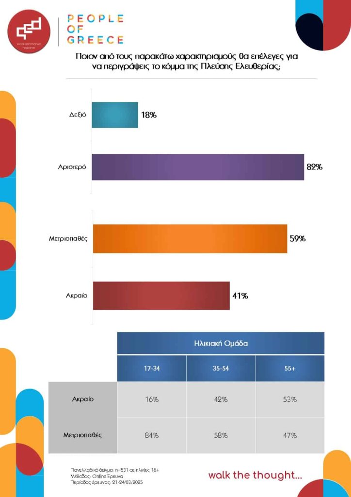 - Η συντριπτική πλειονότητα των Ελλήνων βλέπουν την Πλεύση Ελευθερίας ως ένα αριστερό κόμμα (82%), ωστόσο οι Έλληνες διχάζονται ως προς το αν η Πλεύση Ελευθερίας είναι ένα ακραίο ή ένα μετριοπαθές κόμμα. Οι νέοι κάτω των 35 ετών επιλέγουν για την Πλεύση Ελευθερίας την ταυτότητα του μετριοπαθούς κόμματος σε συντριπτικό ποσοστό (84%), χαρακτηριστικό που ερμηνεύει τη σαφώς υψηλότερη απήχηση του κόμματος στους νέους.